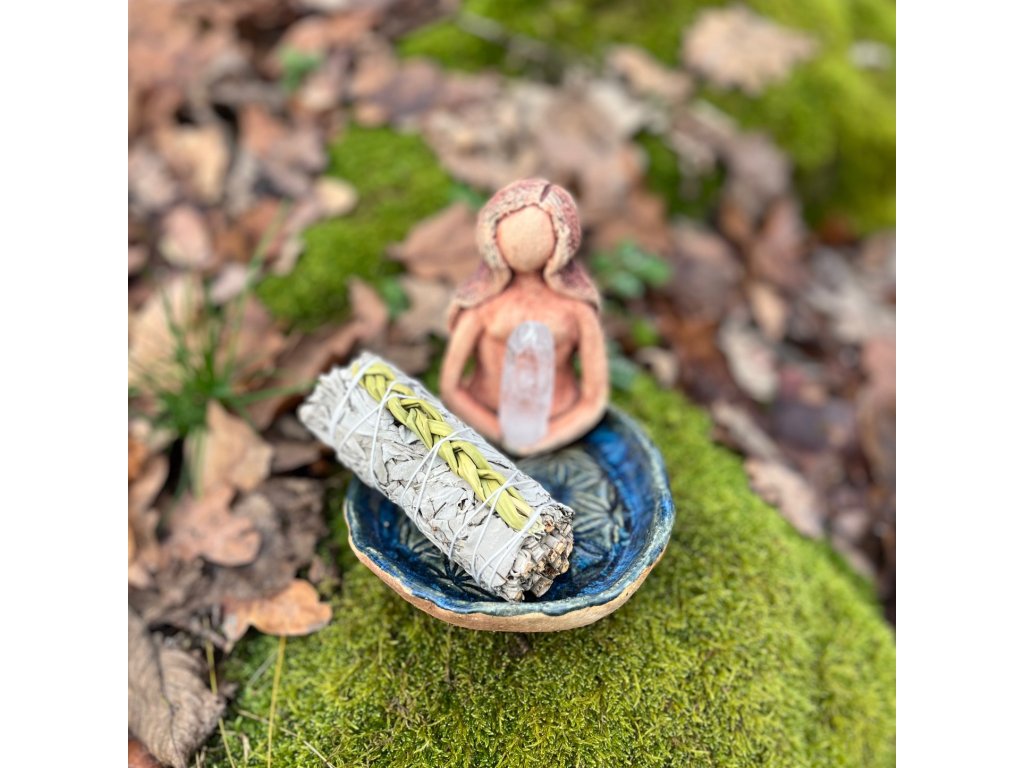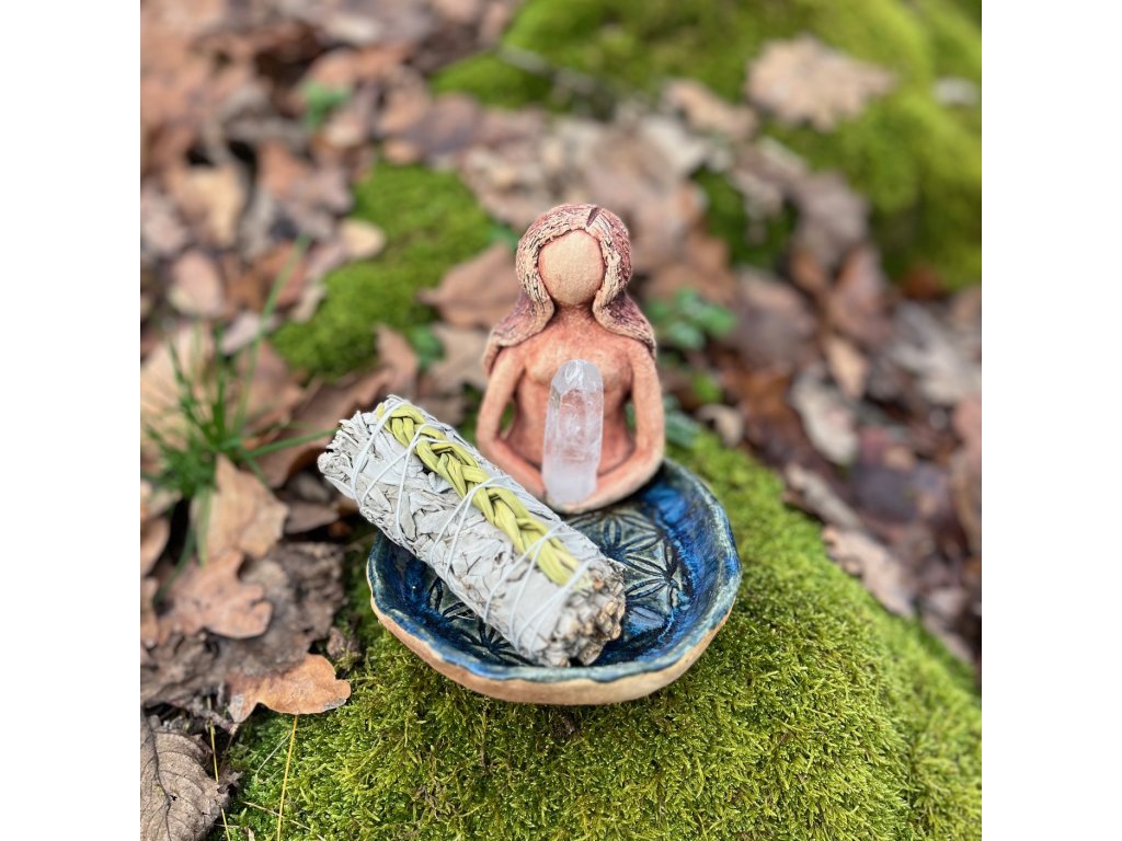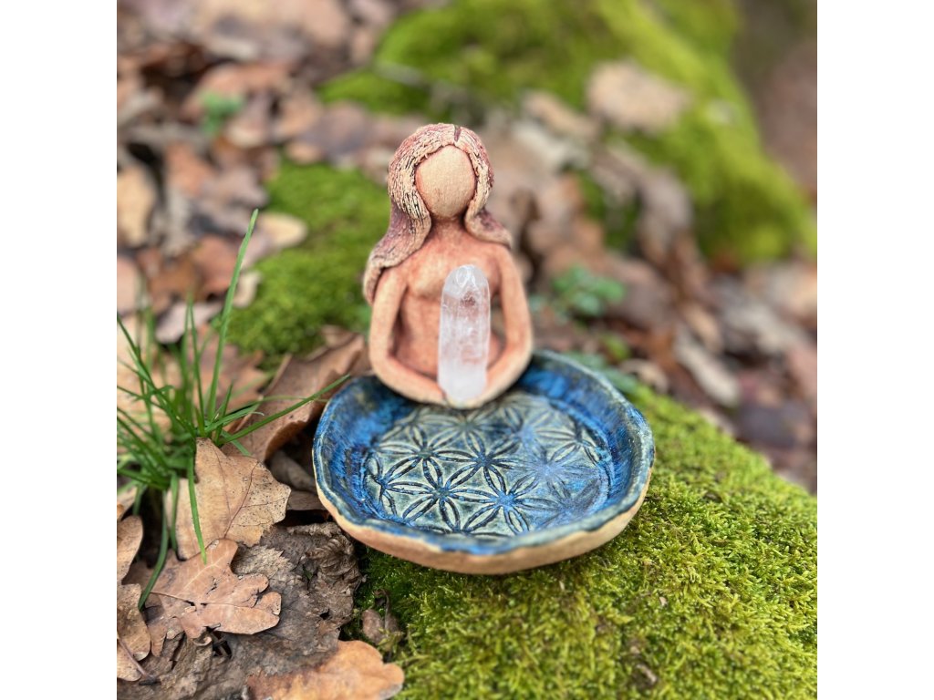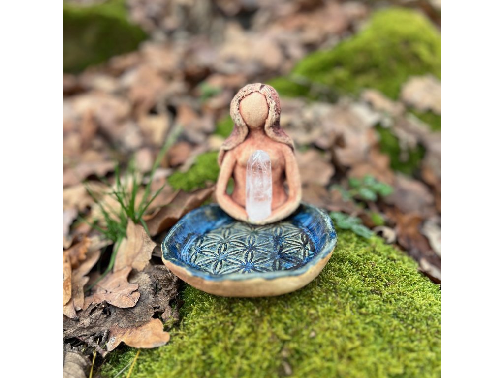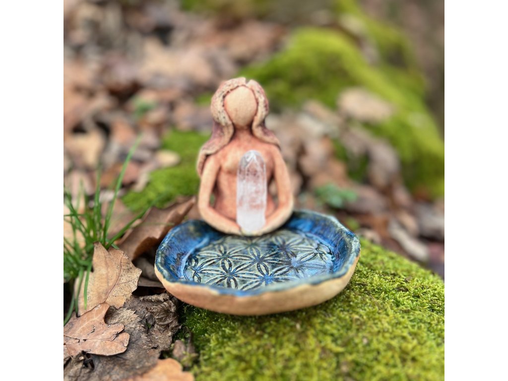 Bohyně s krystalem může sloužit jako stojánek na vykuřovadla, nebo svíčku. Velikost cca 14x12cm.