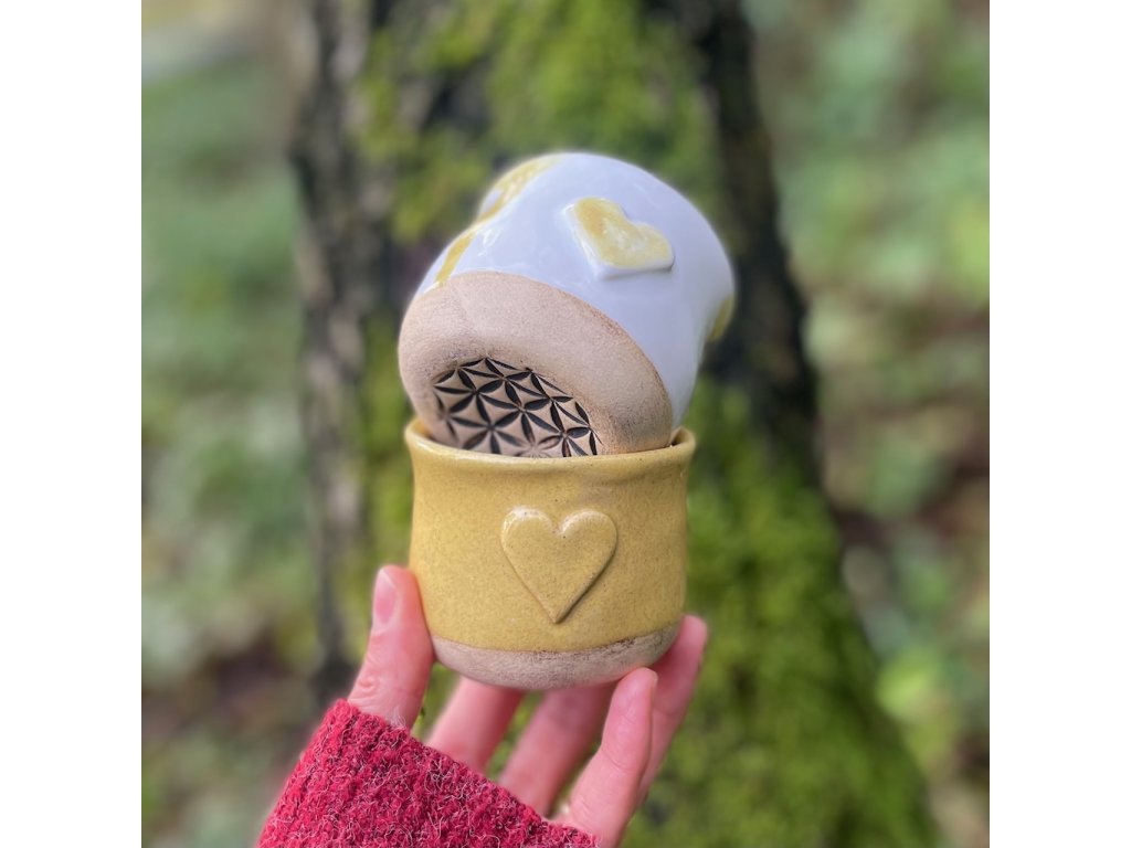 Ručně modelované keramické hrnky jsou vyrobený z točířske hlíny, Na hrnky byla použita glazura na užitkové účely. Obsah hrnku je cca 180-200ml. Cena je za dva hrnky.