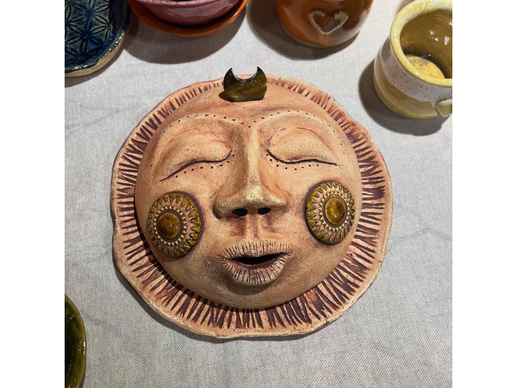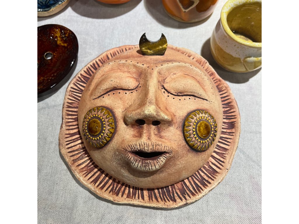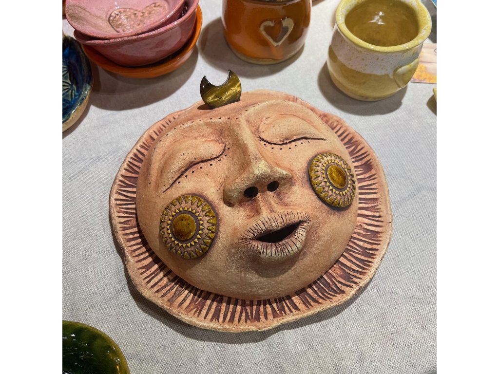 Slunce na vykuřovaní ze šamotové hlíny s křišťálem tygřího oka. Průměr cca 21cm.